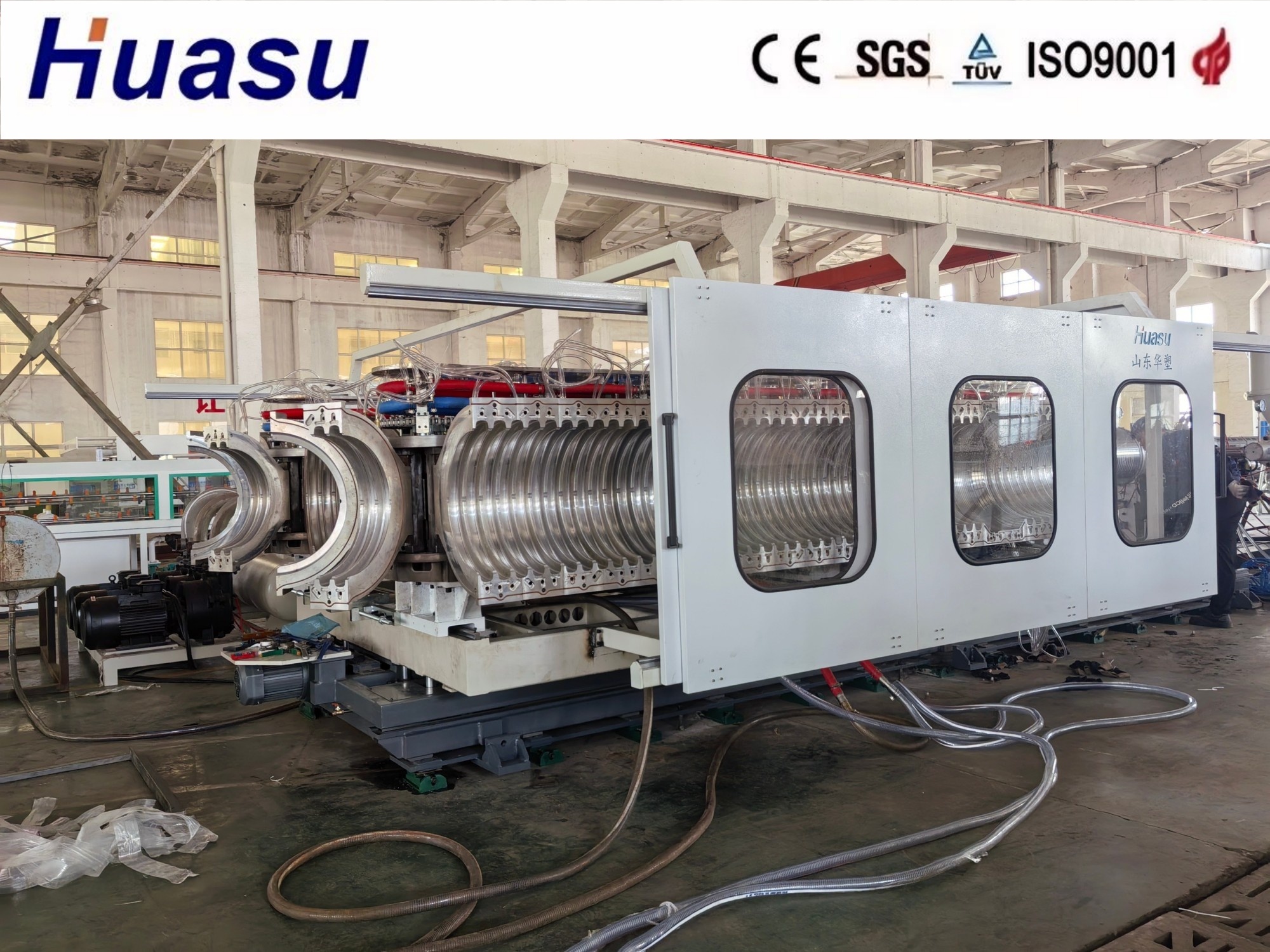 डबल वॉल नालीदार पाइप लाइन, शेडोंग हुआसू से उन्नत तकनीक की तीसरी पीढ़ी का प्रतिनिधित्व करती है। इस उन्नत संस्करण में पिछले मॉडलों की तुलना में एक्सट्रूडर आउटपुट और उत्पादन गति में 20-40% की वृद्धि सहित महत्वपूर्ण सुधार शामिल हैं। ये संवर्द्धन एक अधिक कुशल ऑनलाइन बेलिंग प्रक्रिया को सक्षम करते हैं, जो नालीदार पाइप उत्पादों की बेहतर गुणवत्ता और प्रदर्शन सुनिश्चित करता है।